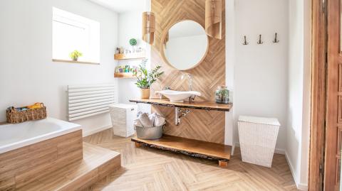 La salle de bains est la pièce exposée à l’humidité par excellence et même en présence d’un système de ventilation performant, il est indispensable de prévoir des matériaux adaptés et résistants face à l’humidité. Utilisez des matériaux durables, du bois traité et des éléments faciles à nettoyer. À titre d’exemple, vous pouvez vous tourner vers les pierres naturelles, le béton, le jonc de mer, le papier peint étanche ou encore les essences de bois comme le chêne, le bouleau, le noyer, le cerisier, le teck, le bambou.